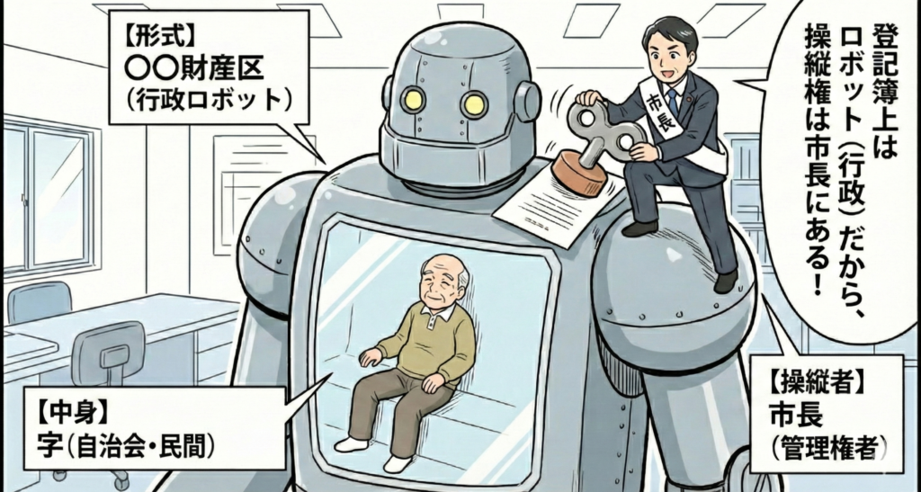 「あれ? 財産区はないって言ってたのに、ここで財産区扱いするのは矛盾してない?」と思われるかもしれません。 しかし、これは「実体(中身)」の話ではなく、「手続(形式)」の話です。 登記簿という『形式』が一度作られてしまった以上、その形式上のルール(財産区なら市長が管理)を利用しなければ、扉を開けることができません。 私たちは「財産区であることを認める」のではなく、「間違った登記を解消するために、あえて相手(登記簿)の土俵に乗って、市長の権限を使わせてもらう」のです。