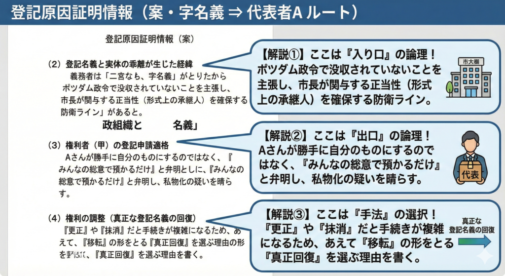 【リライトのポイント】 パターンⅡのロジックに加え、「なぜ個人名義にするのか(受託者としての地位)」についての法的根拠(昭和28年先例)を、別項目として明確に立てます。