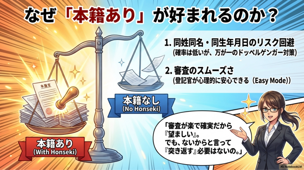 - 同姓同名・同生年月日のリスク回避:確率は低いですが、世の中には「氏名も生年月日も同じ」という他人が存在する可能性があります。本籍があれば、より確実に本人特定ができます。