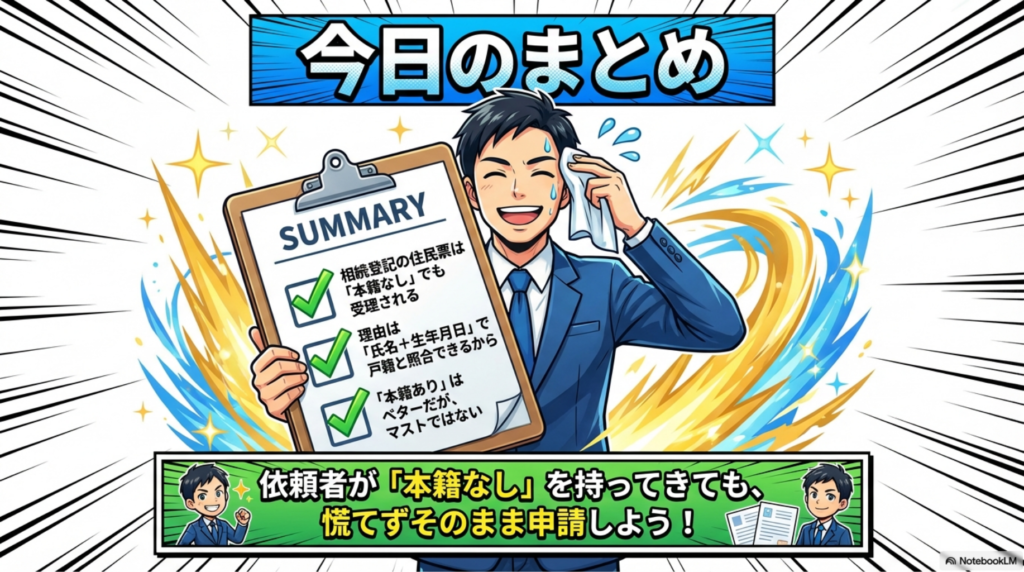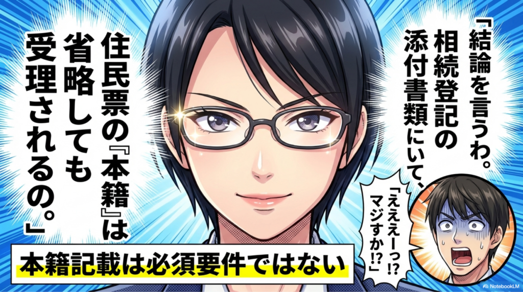 この2点(氏名・生年月日)が一致していれば、たとえ本籍の記載がなくても「相続人本人である」と特定(同一性の確認)ができるため、本籍記載は必須要件ではないのです。