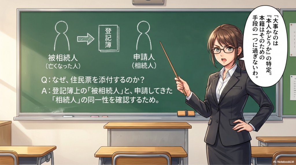 登記官は、この「戸籍」と「住民票」を照らし合わせて、申請人が相続人本人であるかを確認します。