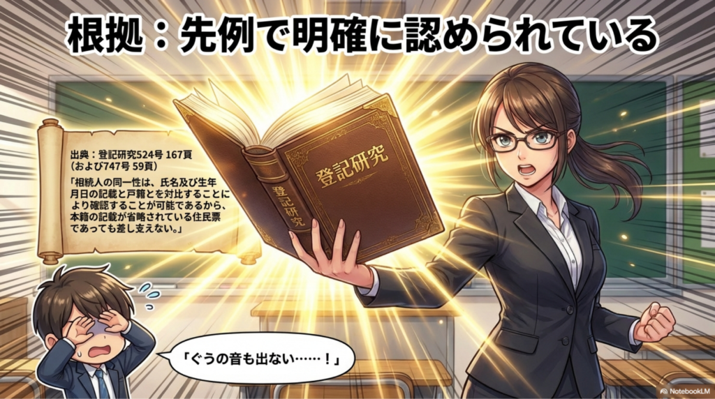 「でも、心配だから…」という方のために、根拠となる先例(登記研究)をご紹介します。
