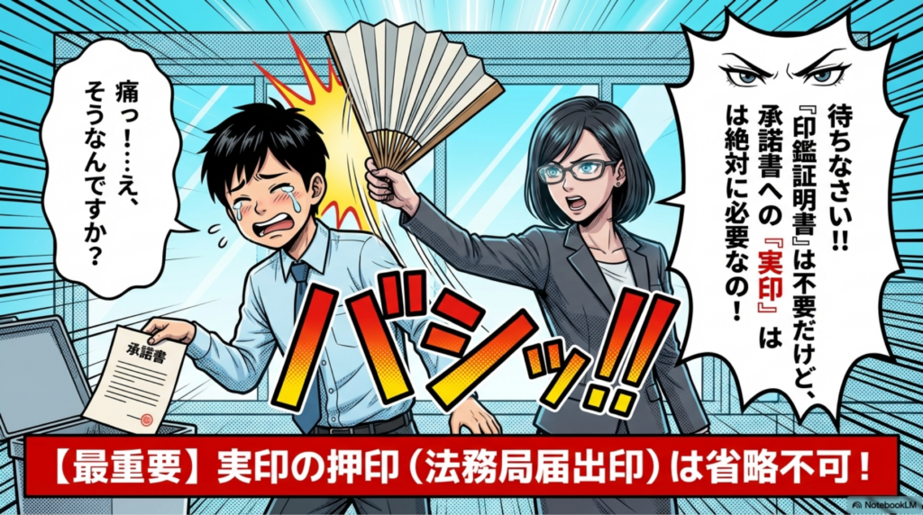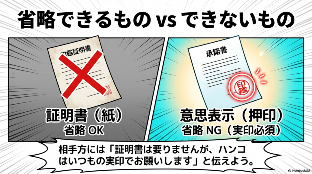 - 「実印」は引き続き必要です! 印鑑証明書の「添付」は省略できますが、承諾書への「実印(法務局届出印)の押印」自体は必要です。 相手方には「印鑑証明書は不要ですが、書類には必ず法務局に登録しているご実印をお願いします」と伝えましょう。