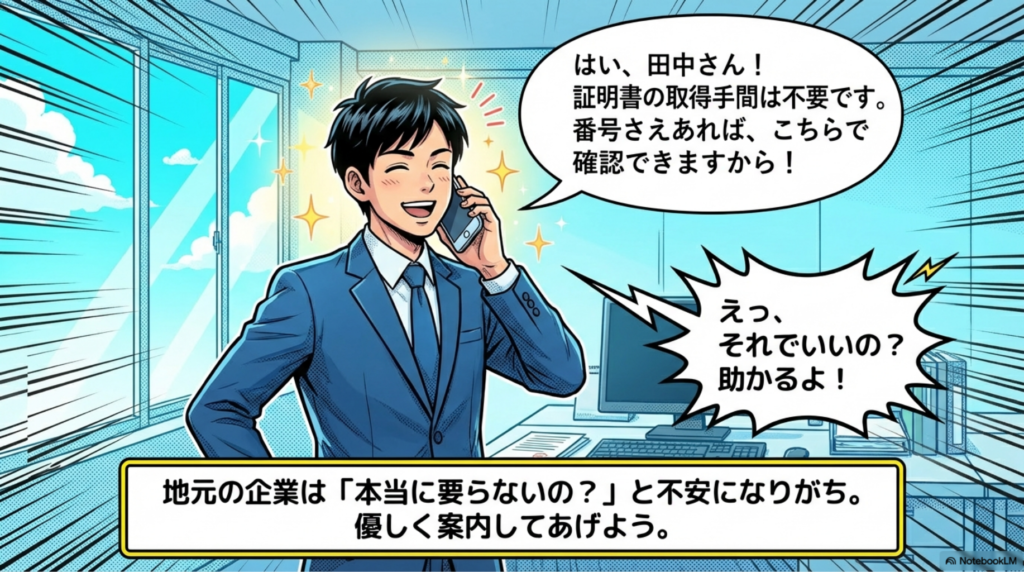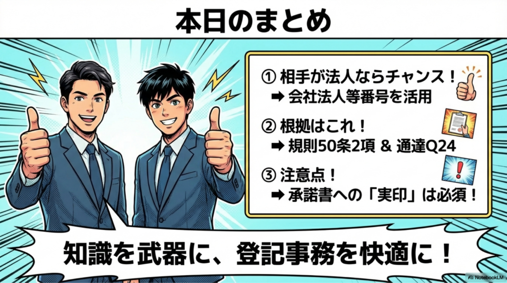 - 地権者(相手方)への配慮 銀行などの金融機関はこの取り扱いに慣れていますが、地元の一般企業などは「本当に印鑑証明書を出さなくていいの?」と不安がることがあります。その際は「市の嘱託登記の手続き上、番号があればこちらで確認できるので大丈夫ですよ」と優しく案内してあげてください。