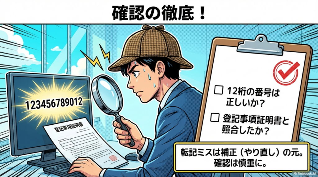 - 番号の転記ミスに注意 会社法人等番号(12桁)が間違っていると、法務局で照合ができず補正になります。登記事項証明書で、必ず正しい番号を確認してください。