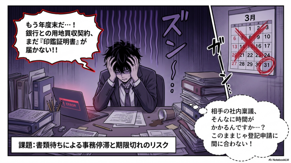 用地買収に伴う所有権移転や、買収地に設定されている抵当権の抹消登記。 相手が銀行や企業の場合、「印鑑証明書をとってください」と依頼してから手元に届くまで、稟議などの関係で意外と時間がかかるものです。