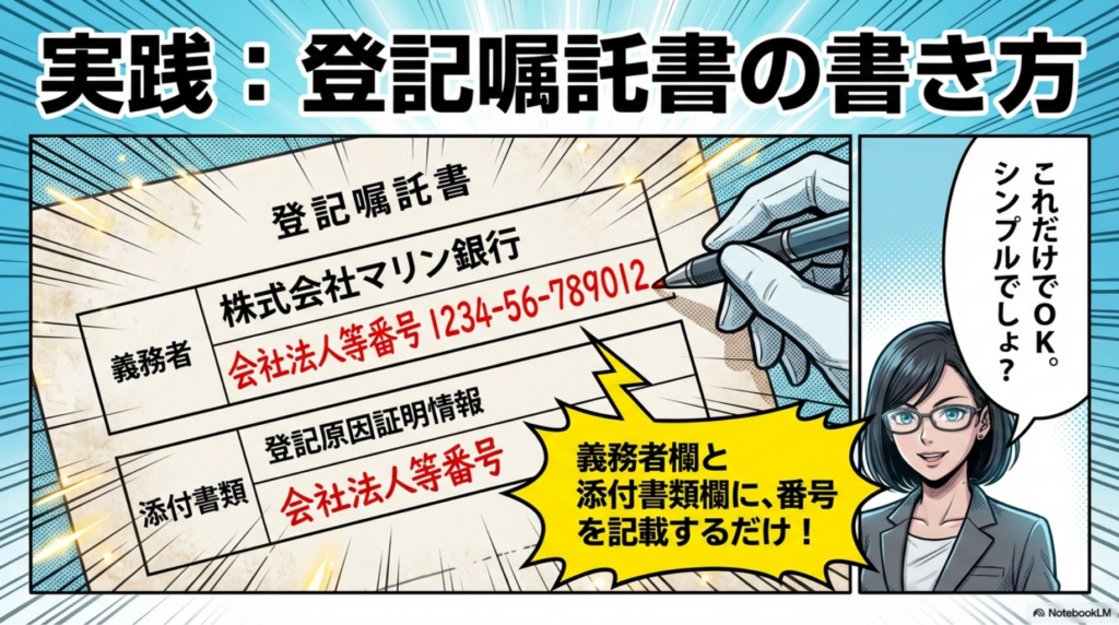 では、実際に登記嘱託書をどう作ればいいのか、具体的な記載例を見てみましょう。