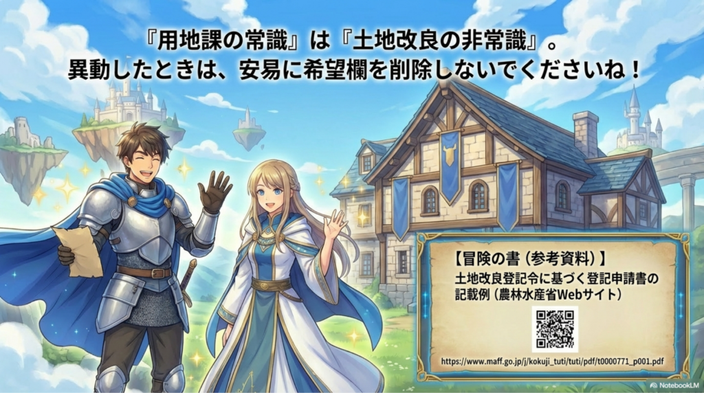 もし、異動で土地改良区などの担当になったら、「前の部署では削除してたから」と安易に消去せず、その事業の根拠法令(登記令)を必ずチェックしてくださいね!