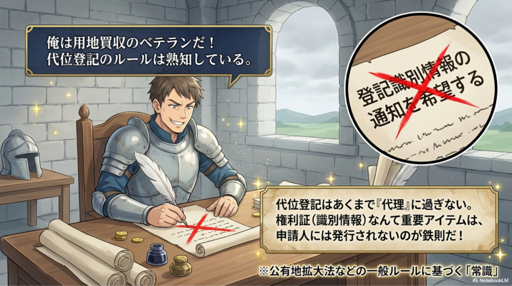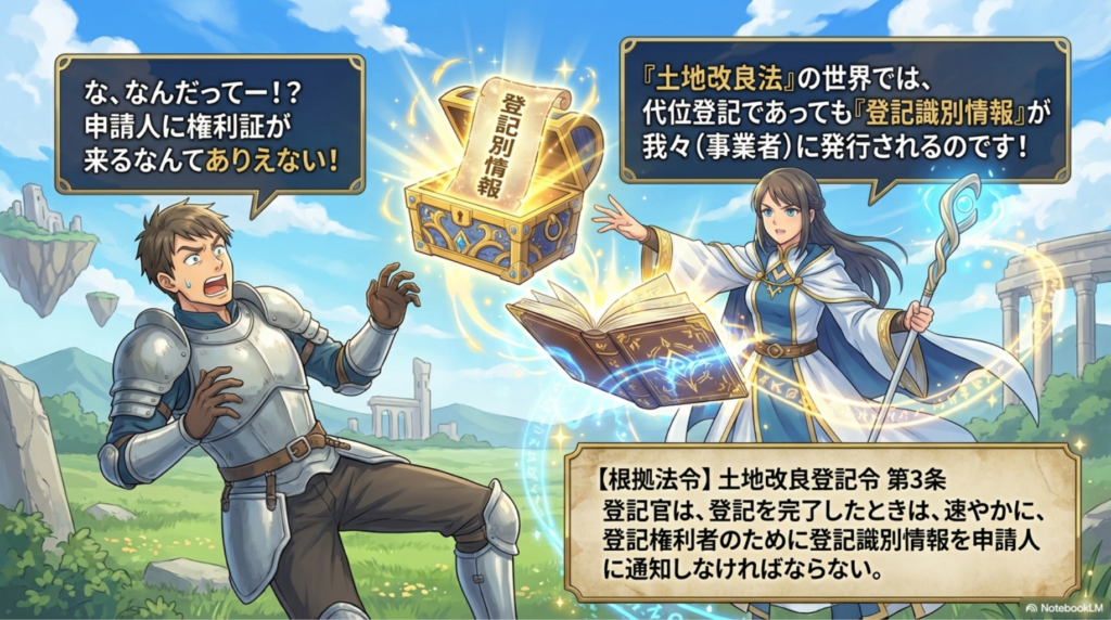 - 土地改良等の事業(代位):法律の特例により、「申請人(事業者)」に識別情報が通知される。→ その後、事業者から地権者(権利者)へ遅滞なく渡す義務がある。