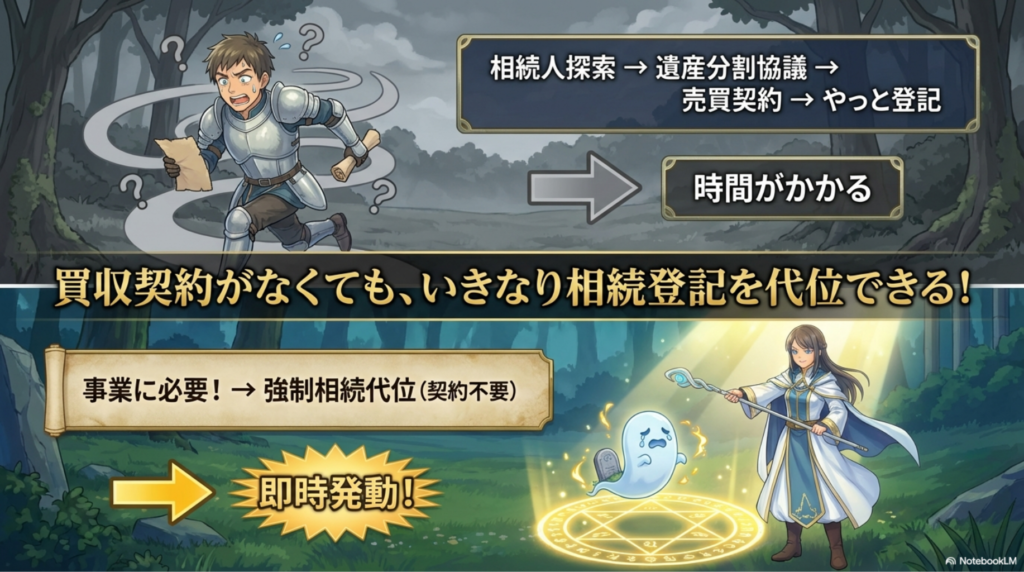 - 土地改良事業者: 事業の必要性があれば、買収契約がなくても、いきなり相続登記を代位で入れてしまうことが可能。