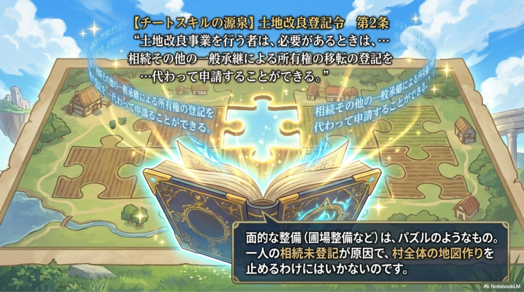 しかし、土地改良事業者は、土地を買収していなくても(契約前でも)、事業に必要なら代位登記ができます。