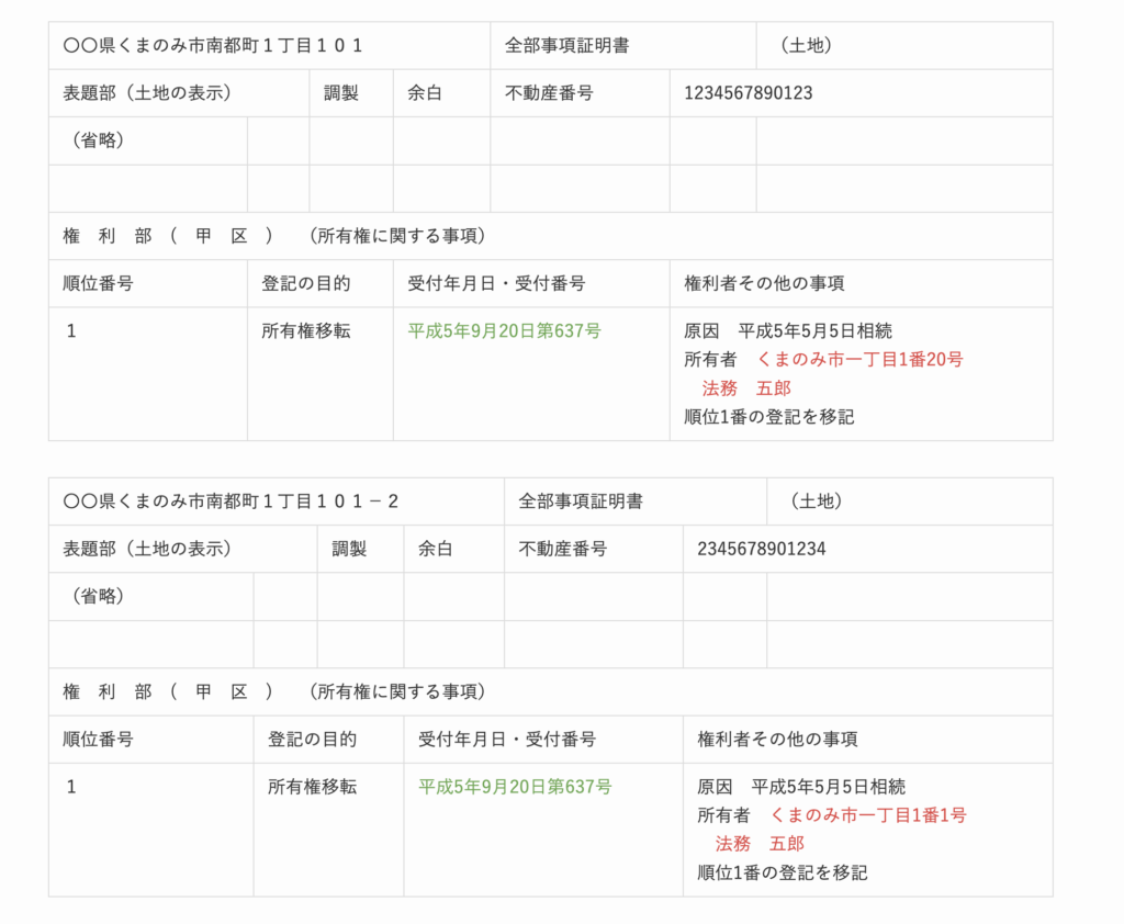 1. 相続登記(平成9年):法務五郎さんは、両方の土地を相続しました。この時の住所は「1番20号」でした。