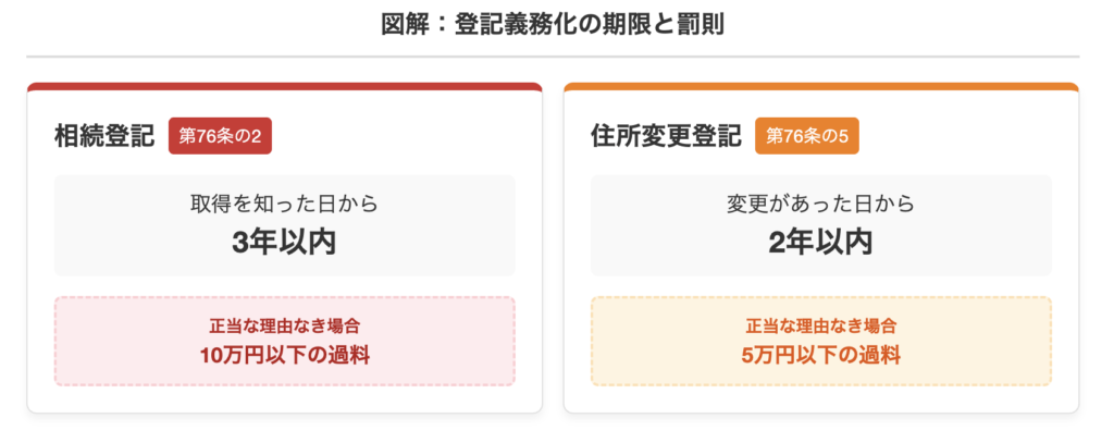 - 相続登記(不動産登記法 第76条の2):相続により所有権を取得したことを知った日から3年以内に申請が必要です。正当な理由なく怠ると、10万円以下の過料の対象となります。