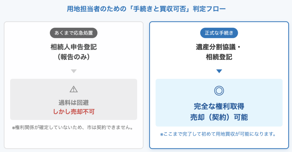 この状態では、市が所有権移転登記(買収)を行うことは不可能です。「申告したから売れる」と誤解している地権者には、「契約の前には、皆様で正式な相続登記(遺産分割協議等)を行っていただく必要があります」と、正確に案内してください。