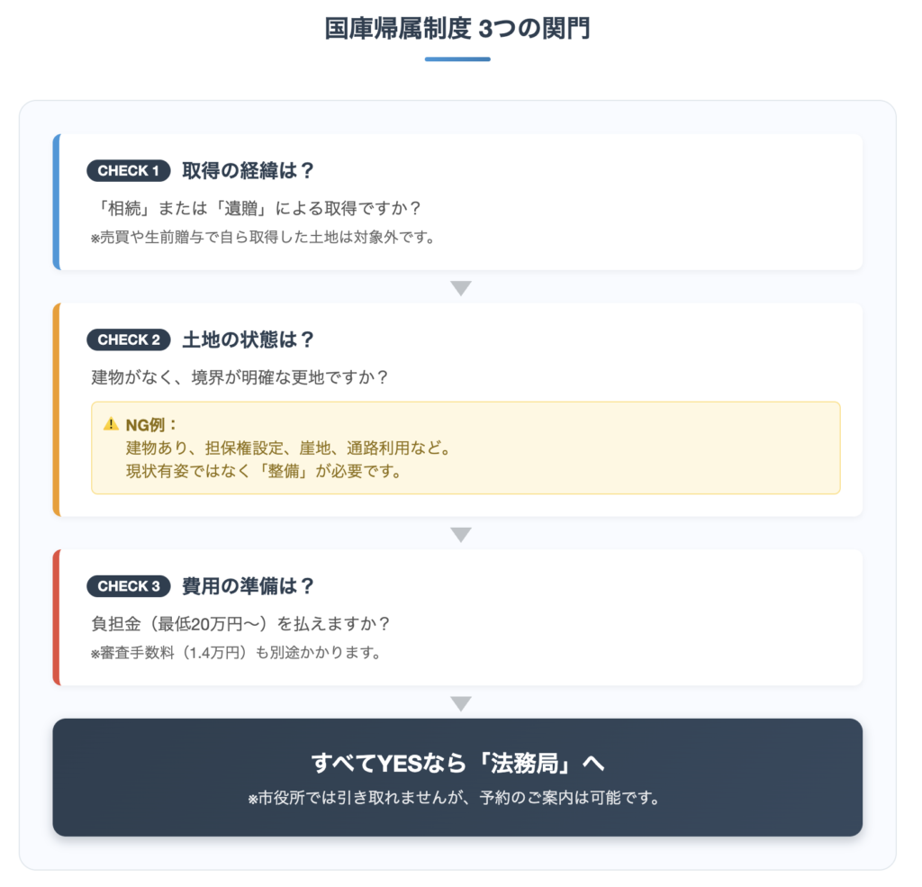 しかし、この制度は「どんな土地でも引き取る」わけではありません。ここを誤解している地権者が非常に多いため、皆さんが最初の交通整理役となる場面が多いのです。