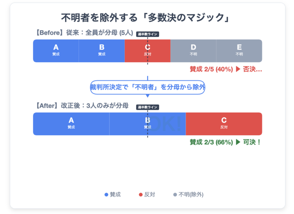 裁判所の決定が出ると、多数決の計算式が変わります。