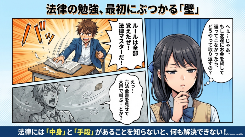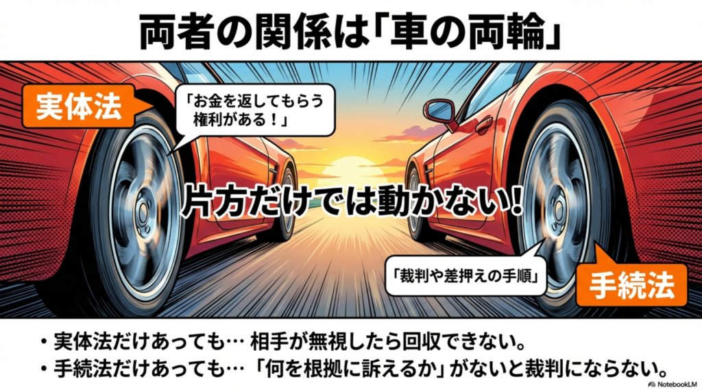 • 実体法だけあっても…「お金を返してもらう権利がある!」と言えても、相手が無視したら回収する手段(裁判や差押えの手順)がわかりません。
