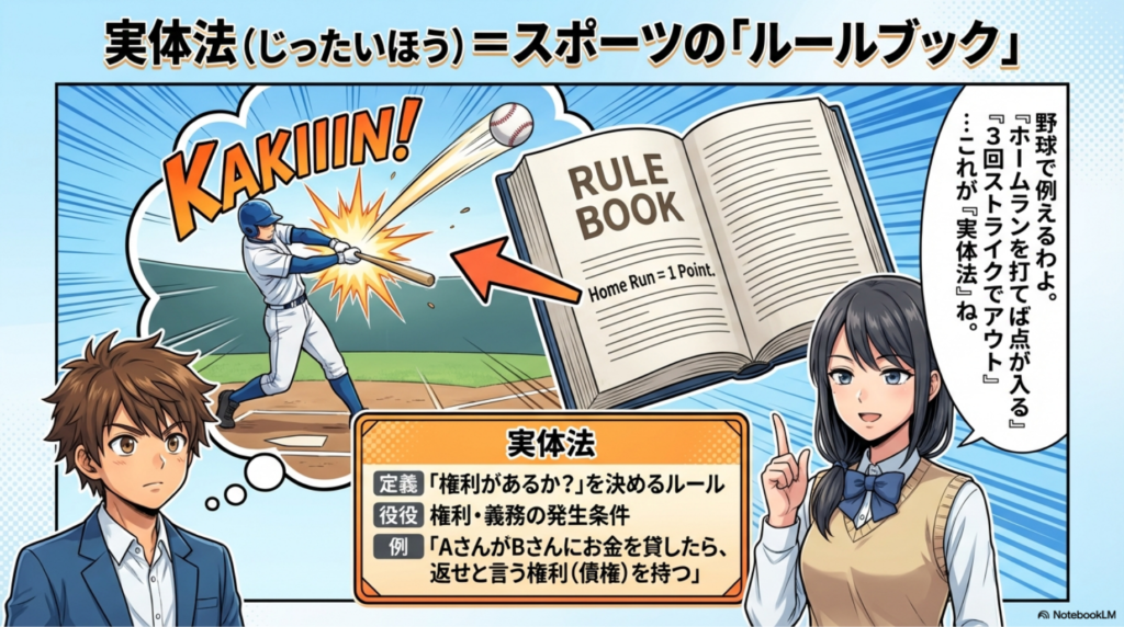 「何をしたら犯罪になるのか?」「借金はどういう契約で成立するのか?」といった、法律関係の「中身」そのものを定めています。