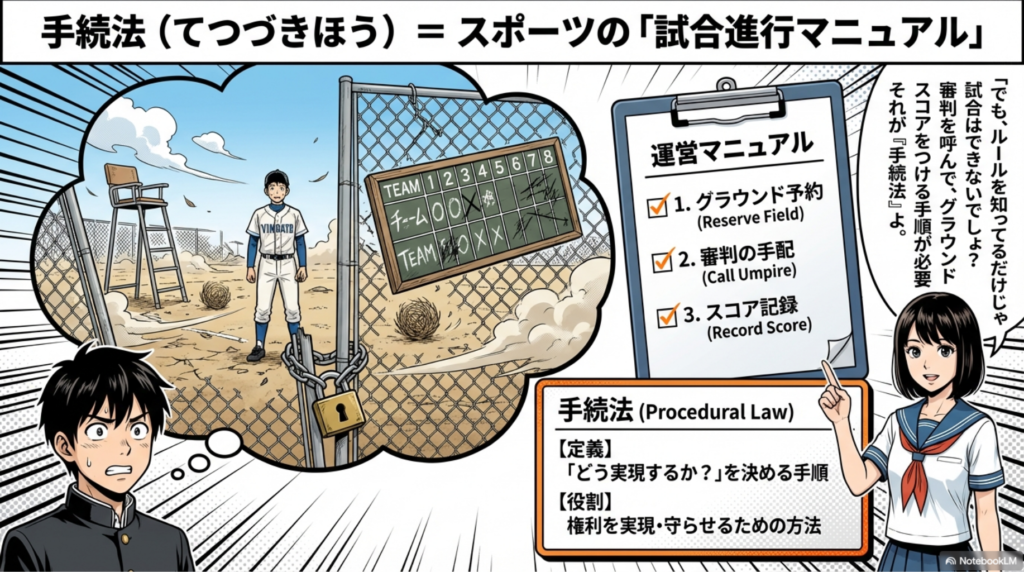 手続法は、その権利を実現したり、守らせたりするための「手順」や「方法」を定めています。
