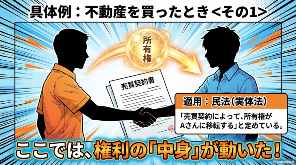 • 民法(実体法): 「売買契約によって、所有権がAさんに移転する」と定めている。