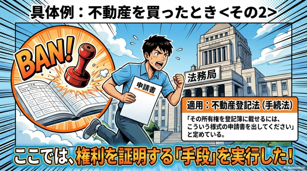 • 不動産登記法(手続法): 「その所有権を登記簿に載せるには、こういう様式の申請書を出してください」と定めている。
